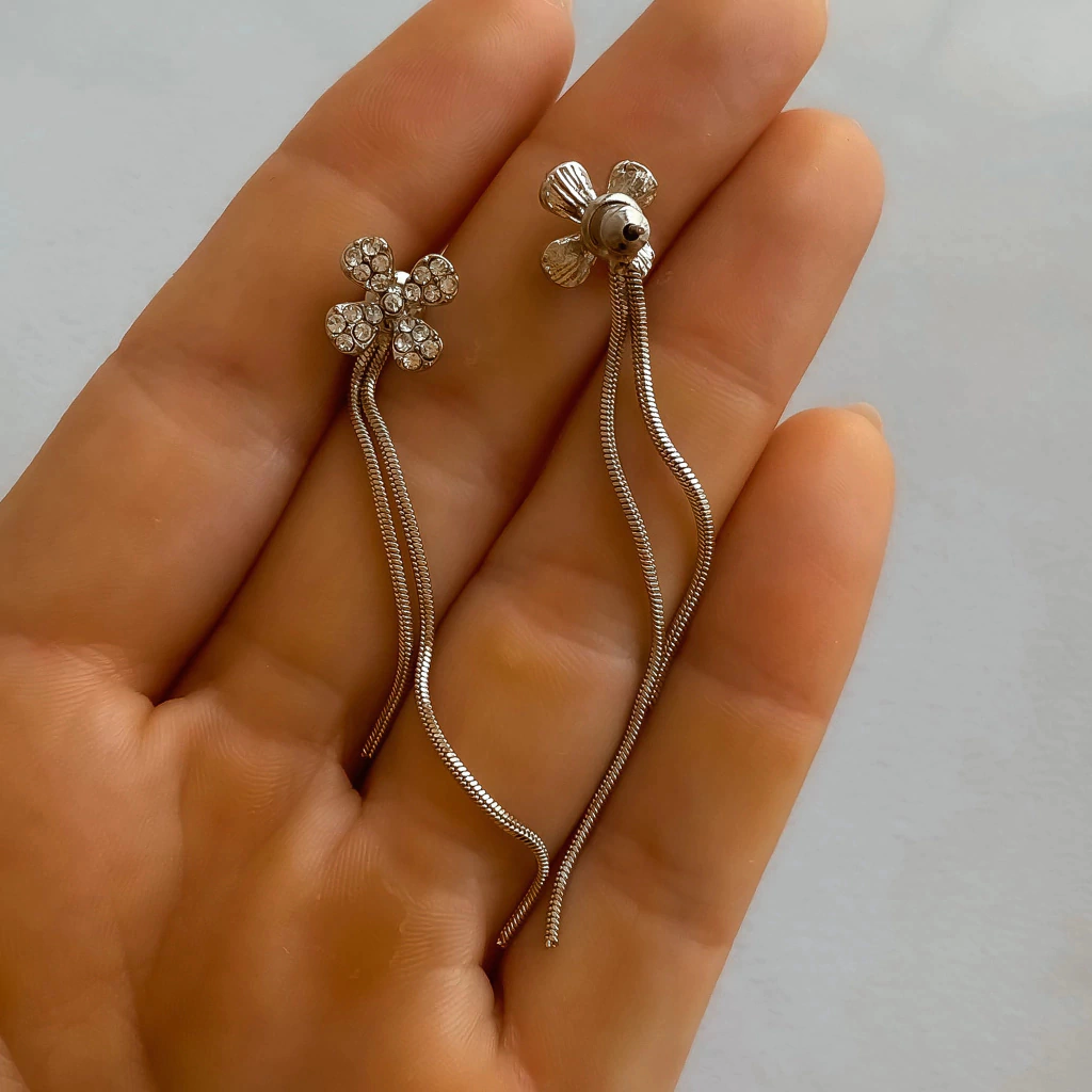 Par de aros con flor terminada en brillantes con cierre colgante de finas cadenas estilo Clapton. Medidas: 6cm de largo.